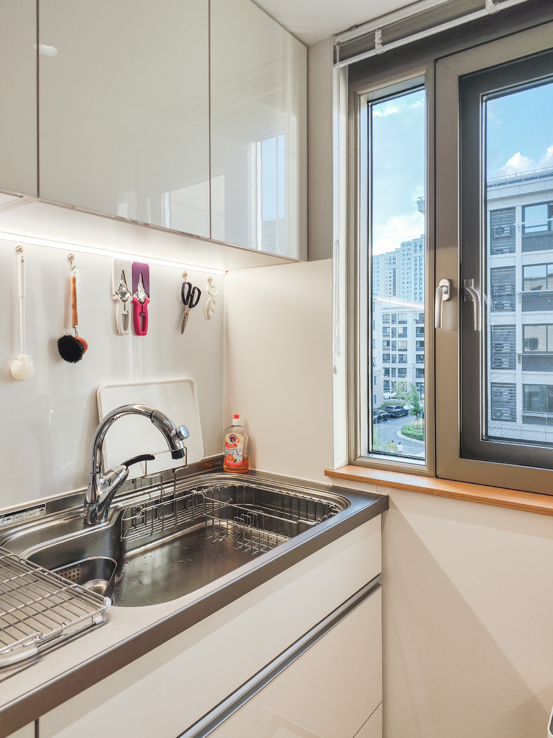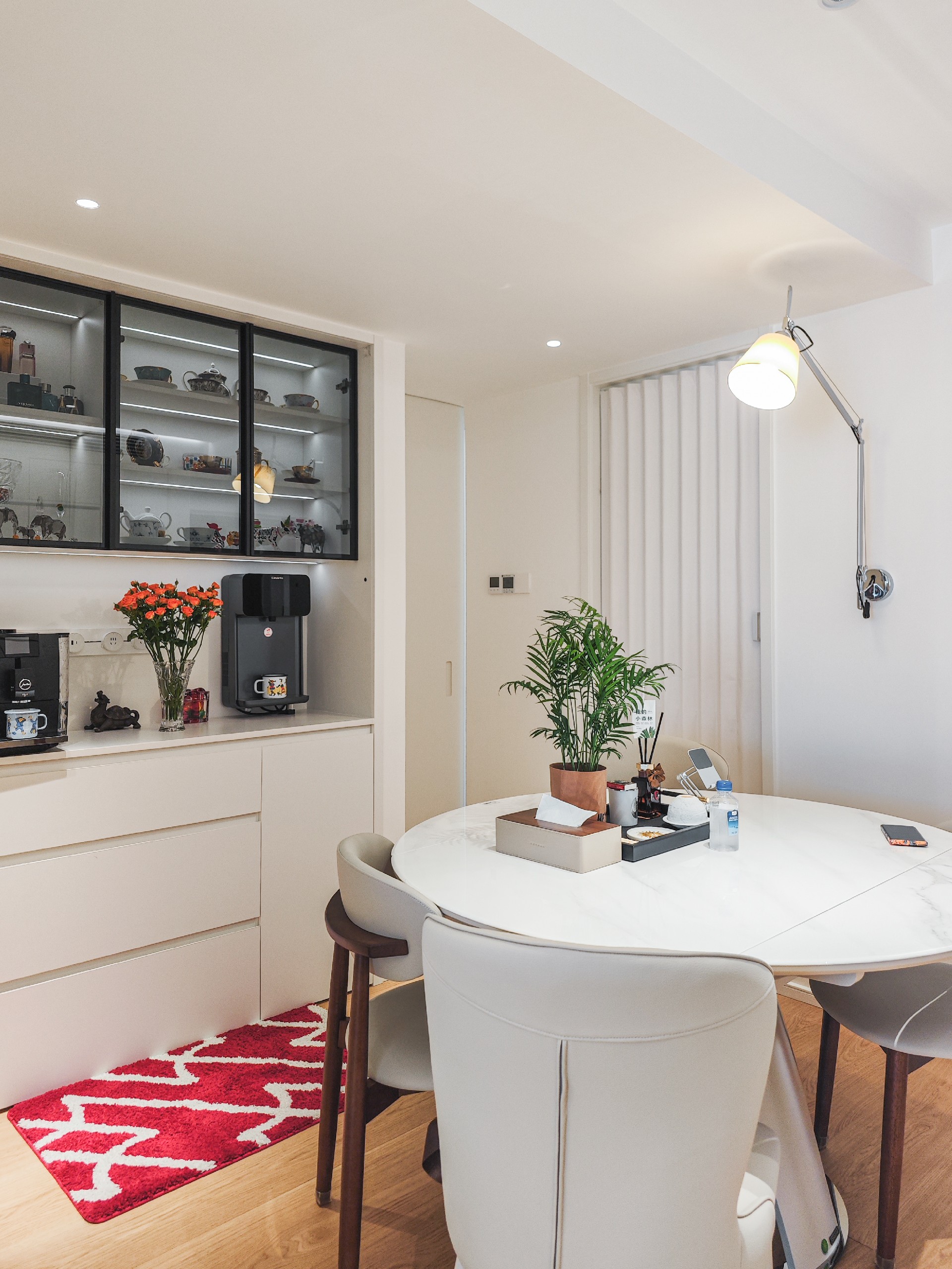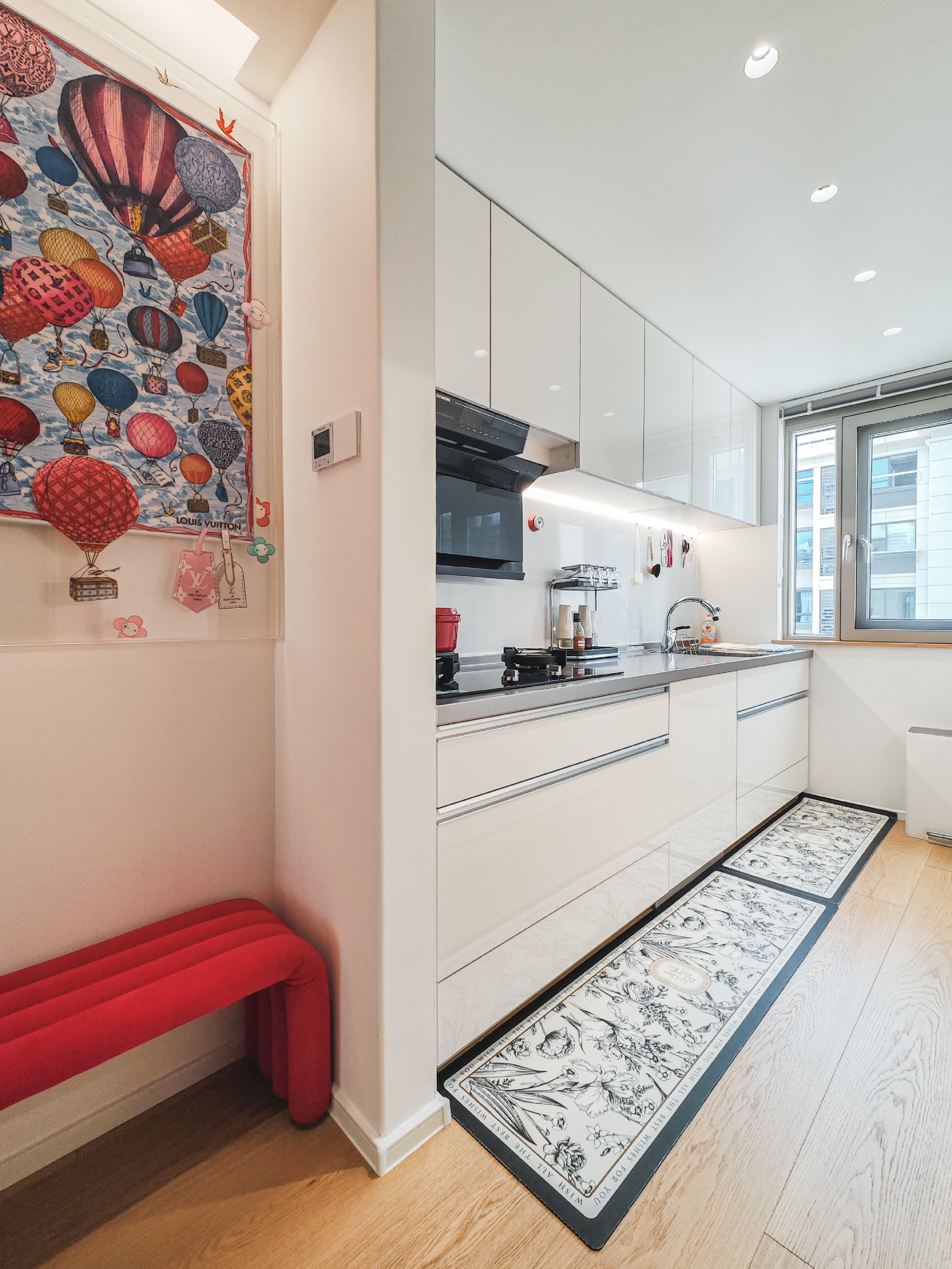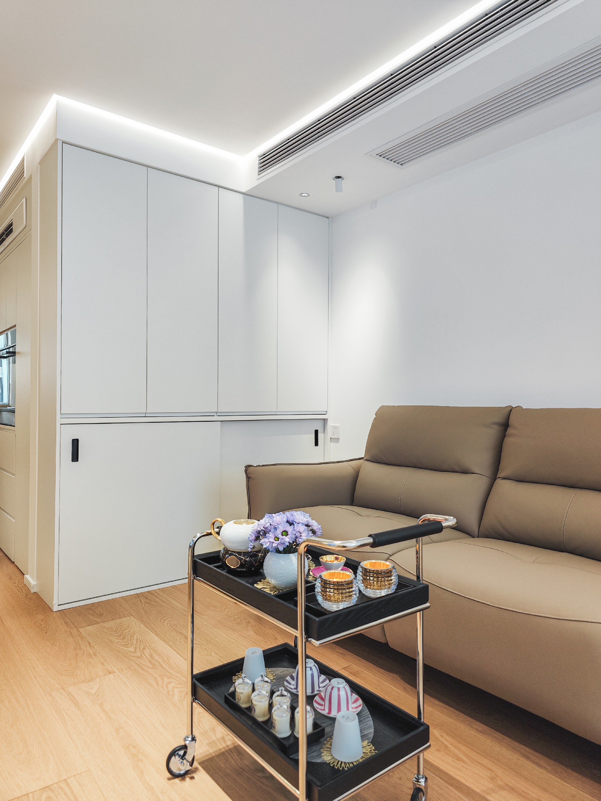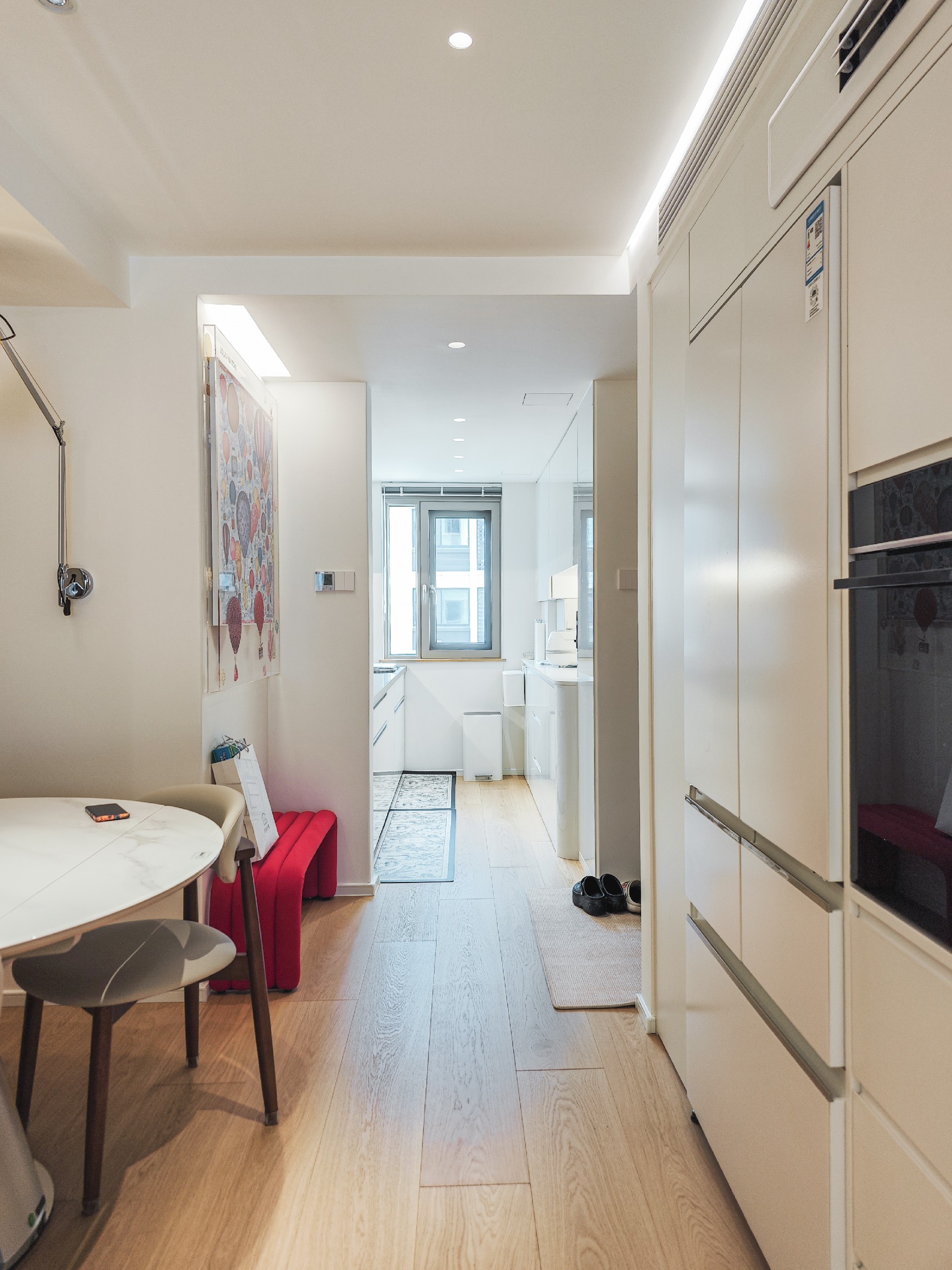 开放式厨房是空间亮点,既满足业主使用习惯,又增强烹饪时的互动感,让狭小空间显得通透。针对收纳痛点,设计师拆除电梯井隔音层,定制嵌入式柜体,完美解决入门处与厨房的储物难题,兼顾实用与美观。