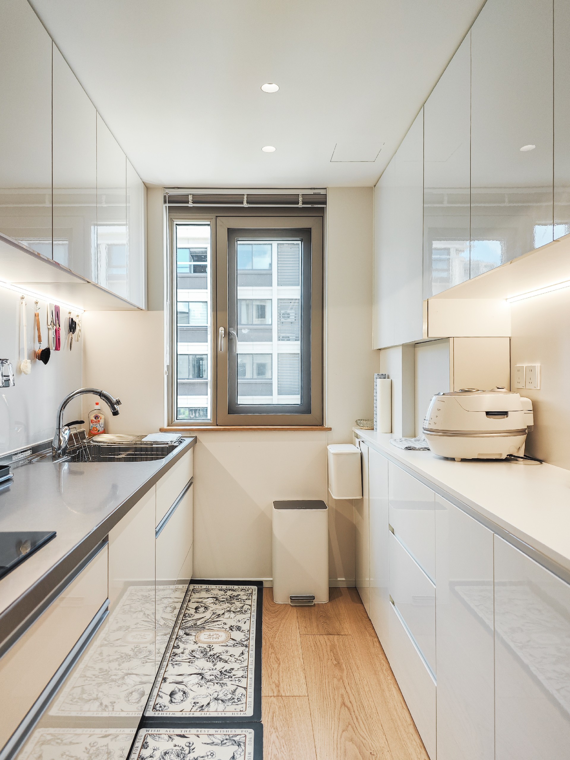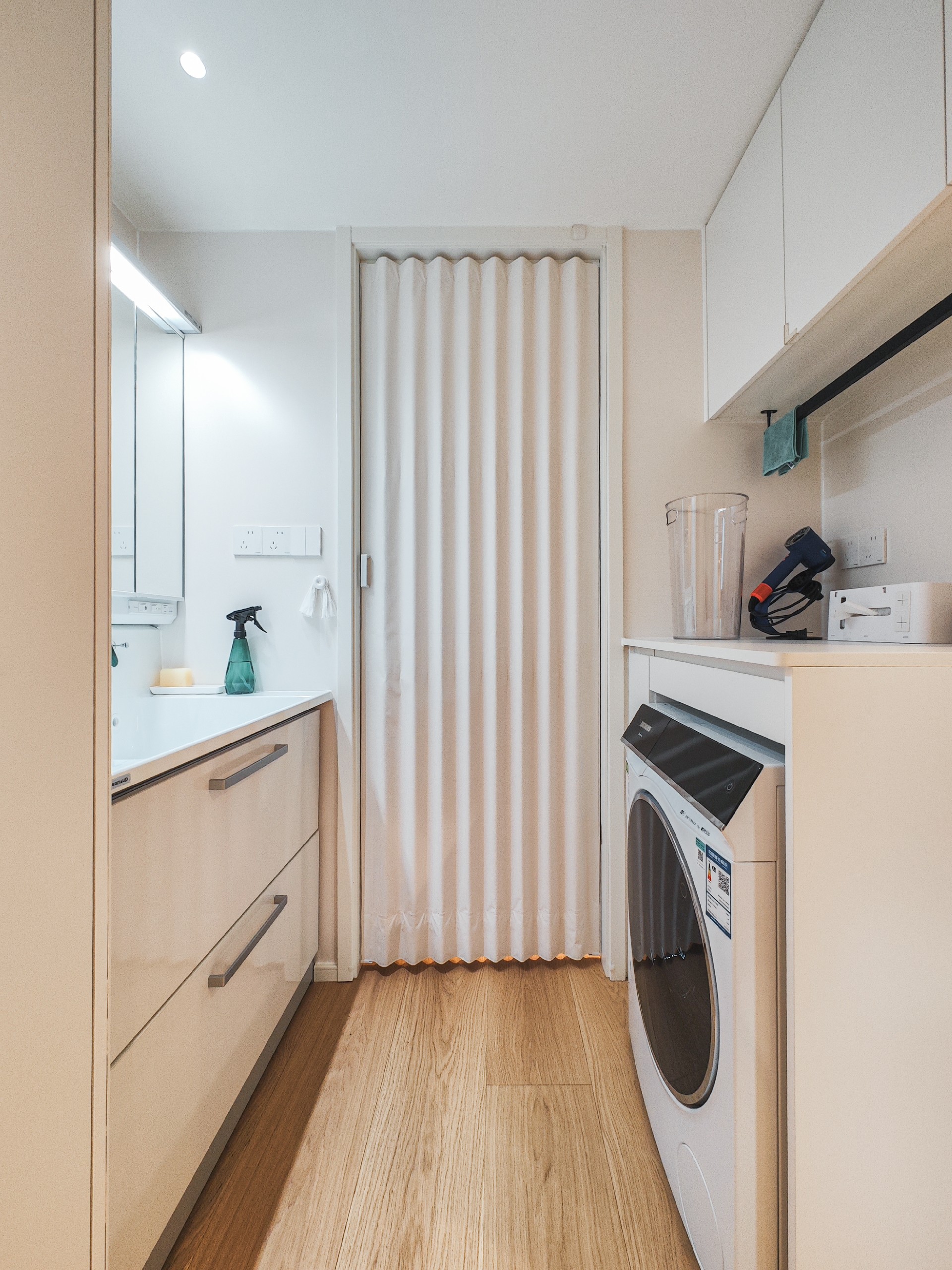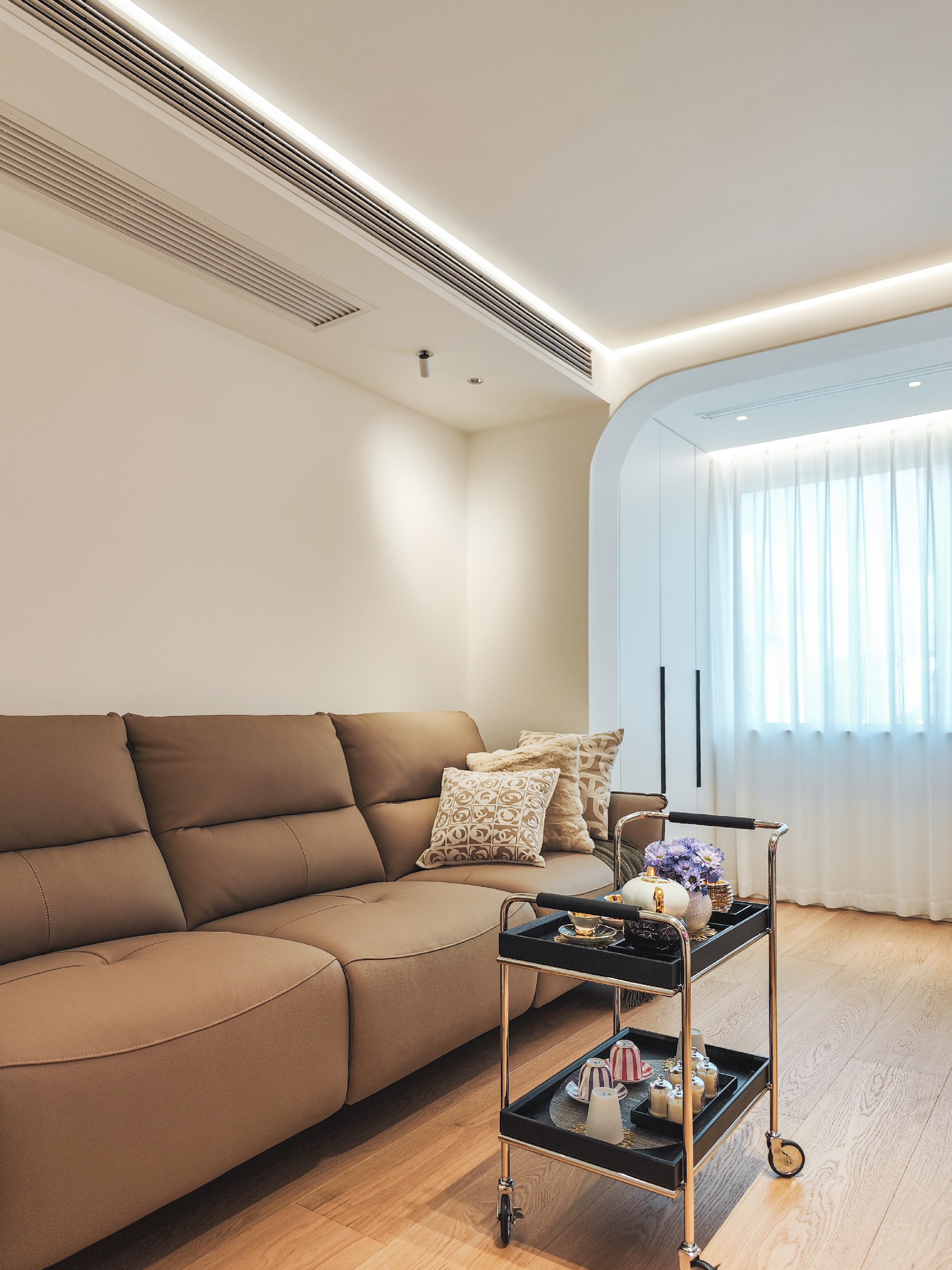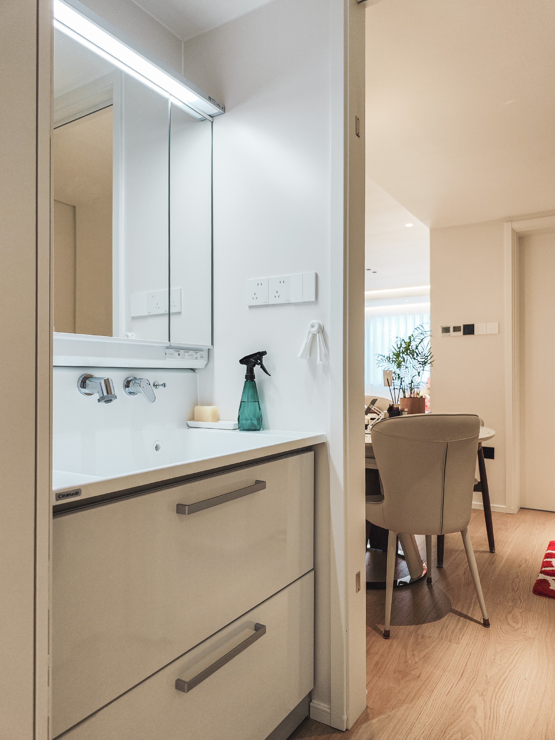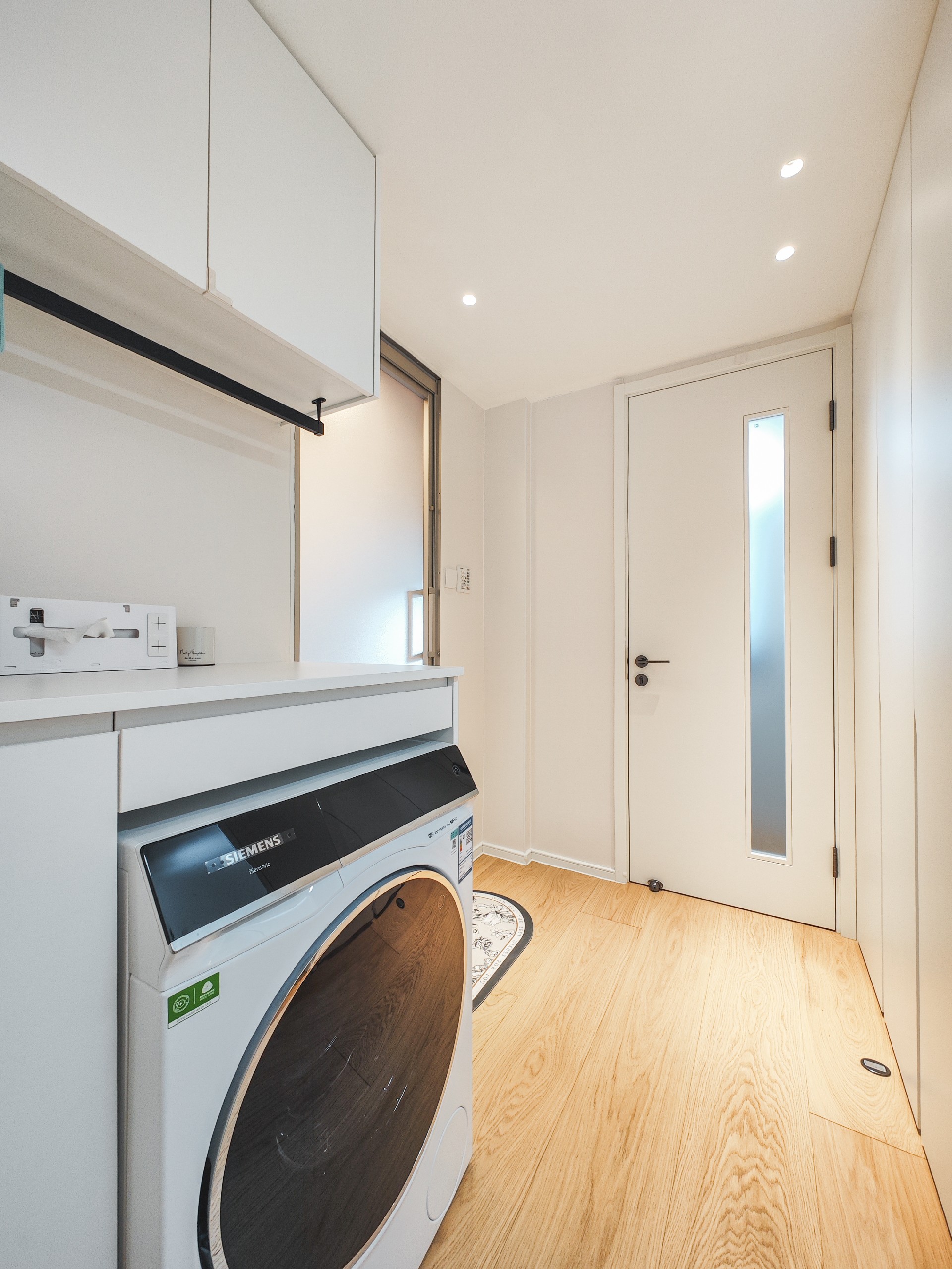 开放式厨房是空间亮点,既满足业主使用习惯,又增强烹饪时的互动感,让狭小空间显得通透。针对收纳痛点,设计师拆除电梯井隔音层,定制嵌入式柜体,完美解决入门处与厨房的储物难题,兼顾实用与美观。