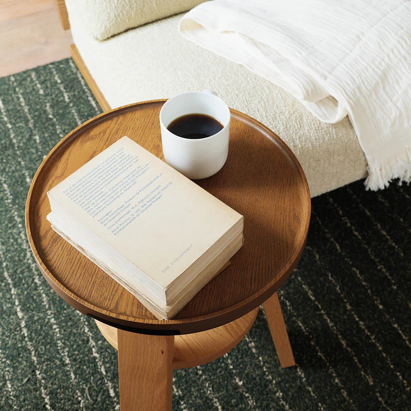 一张好的边几,是家里最懂你的「灵活配角」。圆形托盘式台面自带防溢围边,咖啡、香薰、书本随手放置都安心,中间的黑色提手设计,让它能轻松穿梭在沙发旁、床侧、书桌边,随用随挪,适配每一个需要临时置物的瞬间。中层置物隔层,刚好收纳遥控器、香薰蜡烛等小物,让角落整洁又有层次。