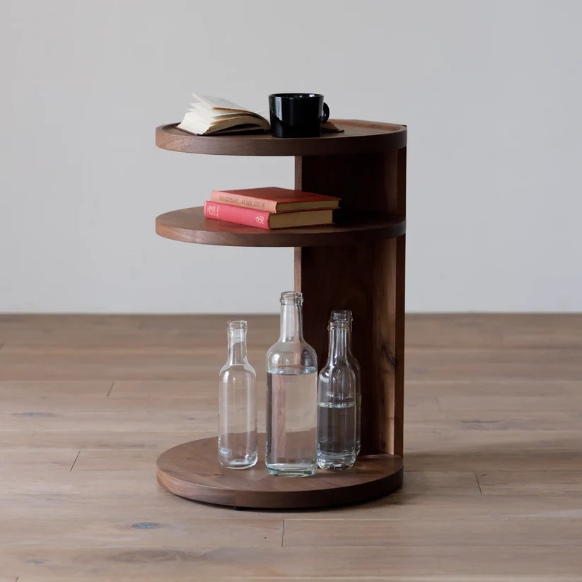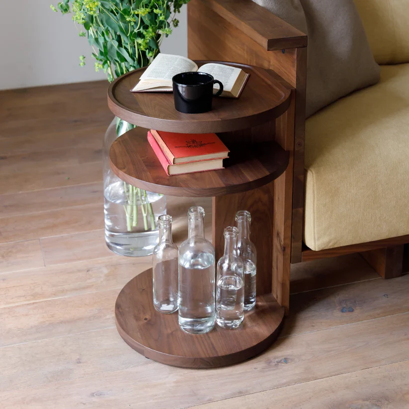 错落阶梯式层架设计,打破传统边几的单调形态,上层可放置杯盏、香薰与翻开的读物,中层与下层则能有序收纳书籍,既是置物台,也是小型开放式书架。