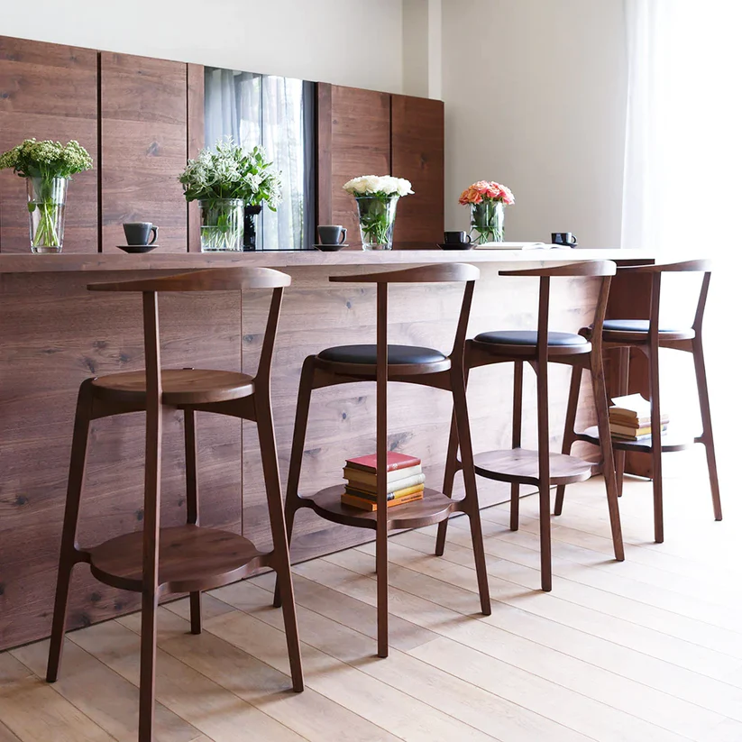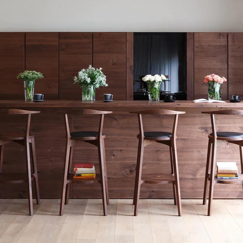 四足的力学结构稳如磐石,中间的脚踏层既是设计巧思,更是贴心的承托,让双脚有处安放;可旋转座面的设计,更添日常使用的灵动与便利。无论是岛台、吧台,它都能瞬间提升空间的质感,成为家里兼具颜值与实用性的点睛之笔。
