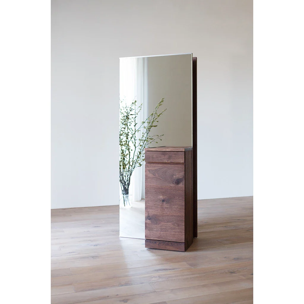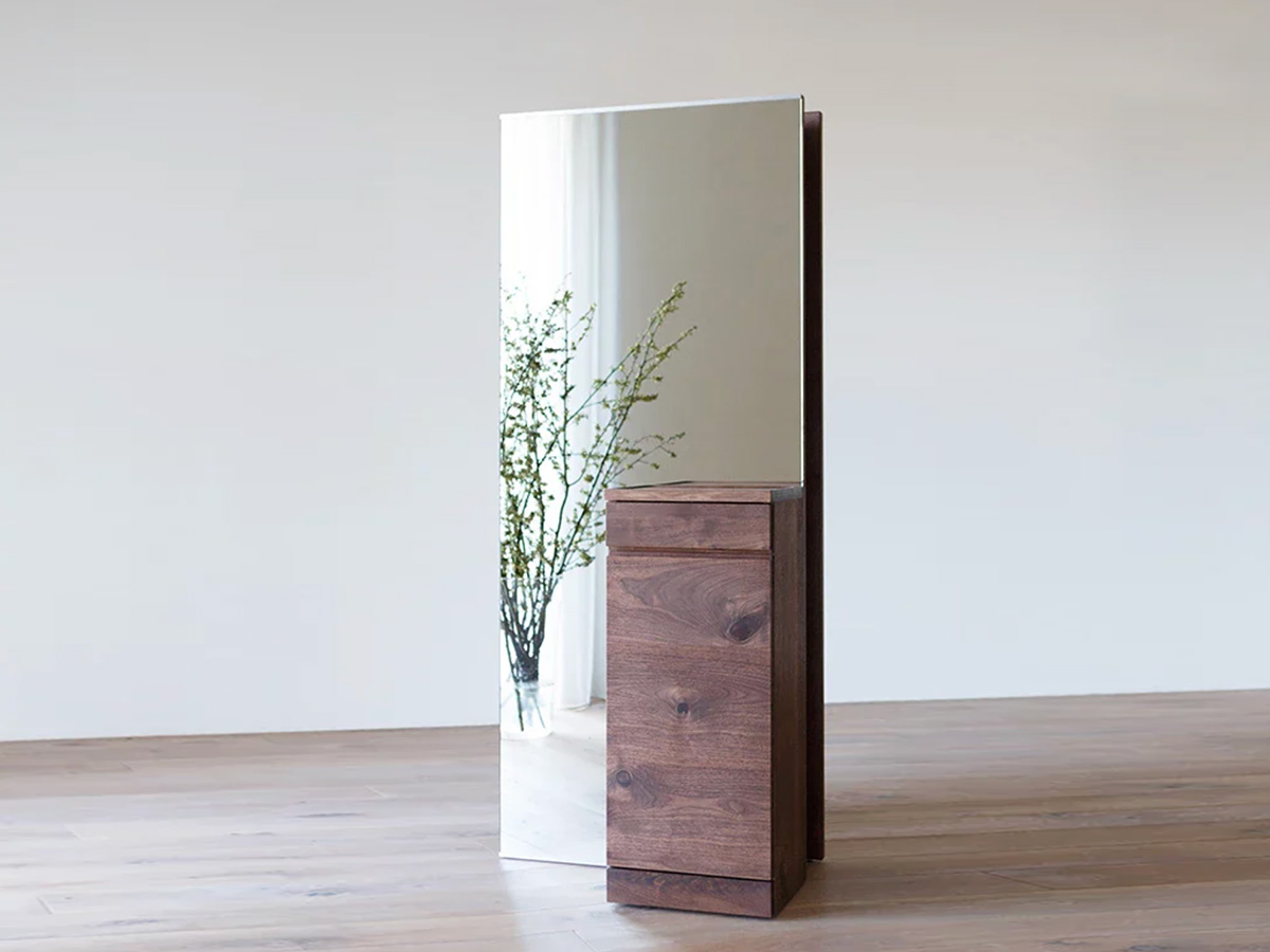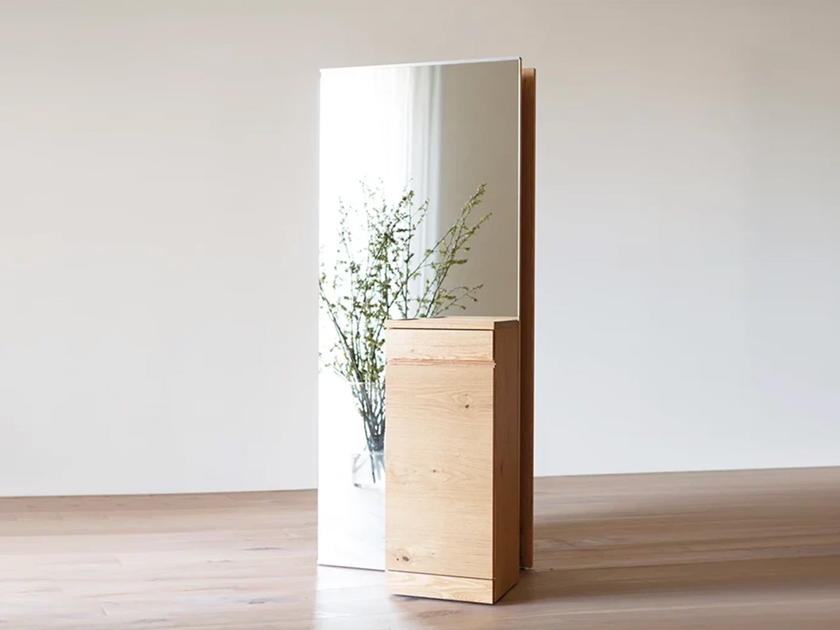 可翻转的全身镜兼顾补妆与穿搭需求,打开镜门便是细密格架与分层置物区,口红、护肤品、首饰各归其位,门背还贴心设计了挂衣钩与补妆镜面;下方抽屉与柜体顺滑静音,可收纳美妆工具与衣物,窄身设计适配小户型,既能置于卧室、玄关或窗边作梳妆台,也能临时变身书桌或边柜,让自然木作的暖意与从容的日常诗意,时刻相伴左右。