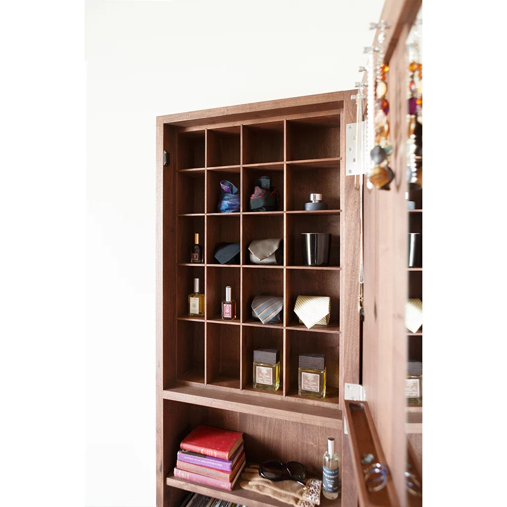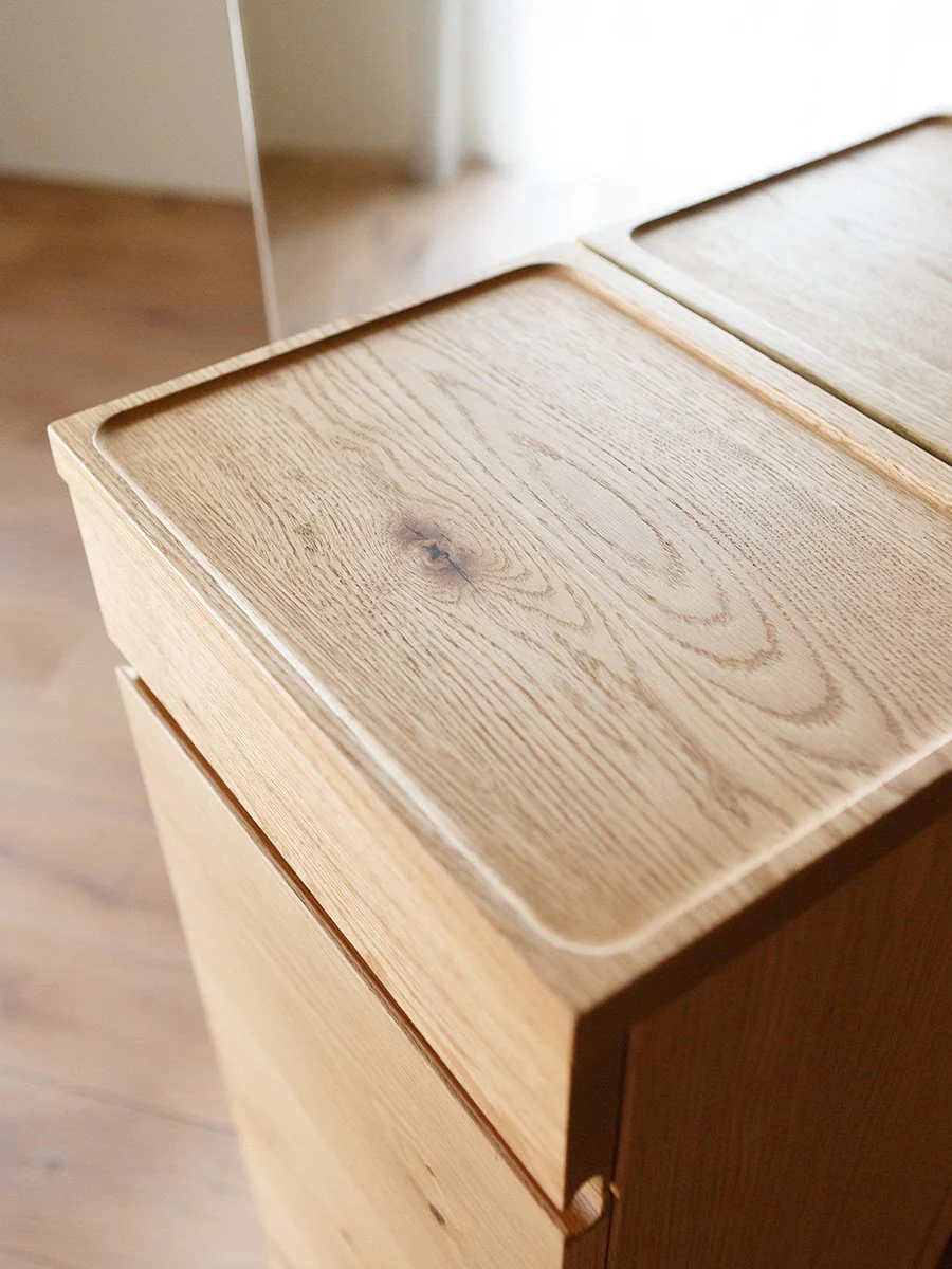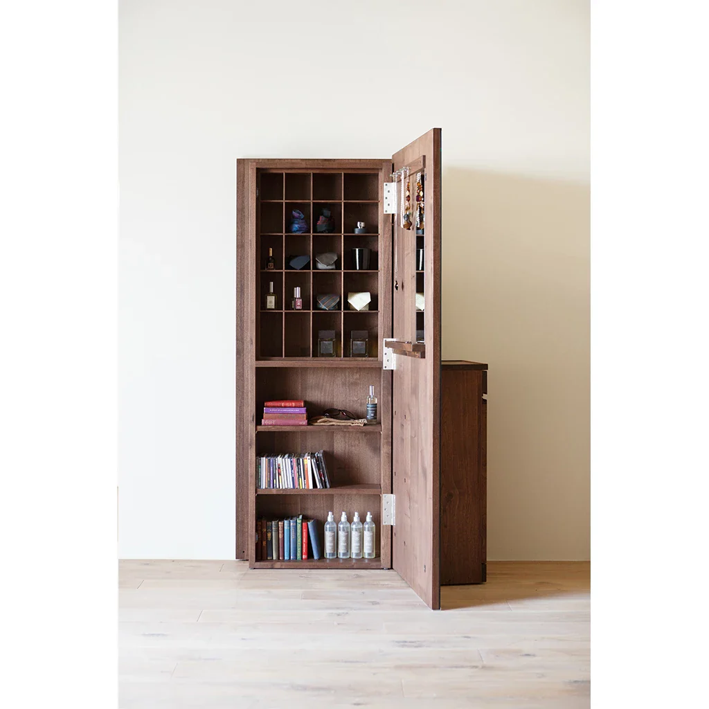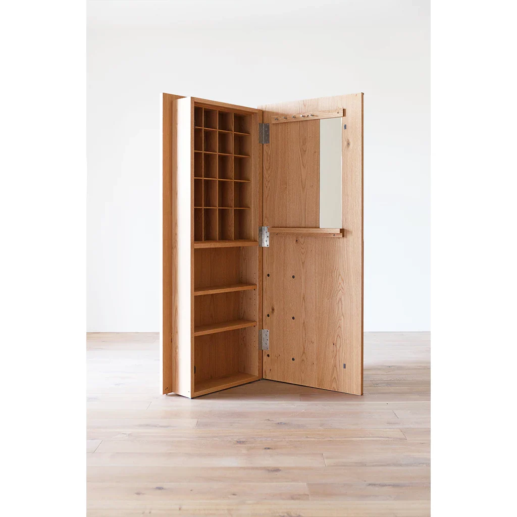 可翻转的全身镜兼顾补妆与穿搭需求,打开镜门便是细密格架与分层置物区,口红、护肤品、首饰各归其位,门背还贴心设计了挂衣钩与补妆镜面;下方抽屉与柜体顺滑静音,可收纳美妆工具与衣物,窄身设计适配小户型,既能置于卧室、玄关或窗边作梳妆台,也能临时变身书桌或边柜,让自然木作的暖意与从容的日常诗意,时刻相伴左右。